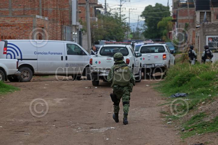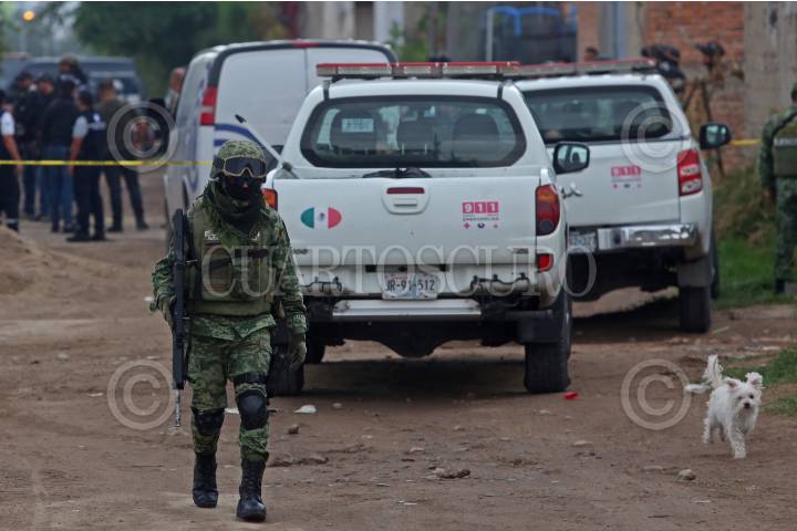 Personal Militar resguarda la zona donde la noche de ayer se registro un enfrentamiento entre civiles armados y policías del municipio así como del estado, el cual dejo como saldo 12 personas fallecidas, en el municipio del Salto, Jalisco.