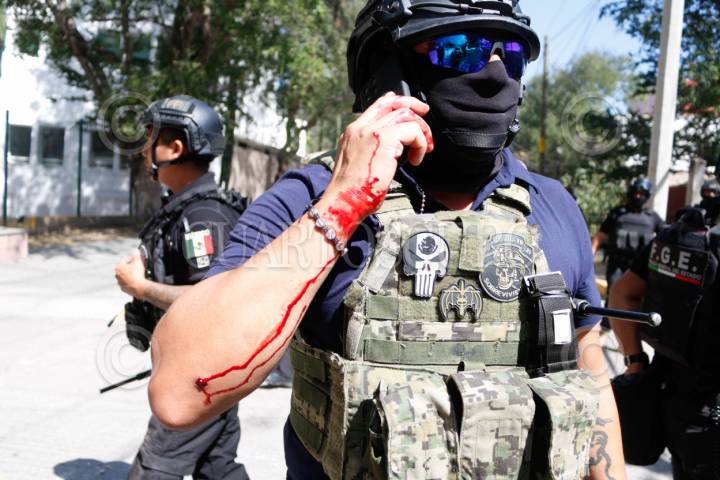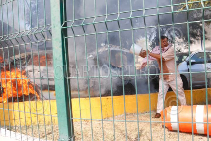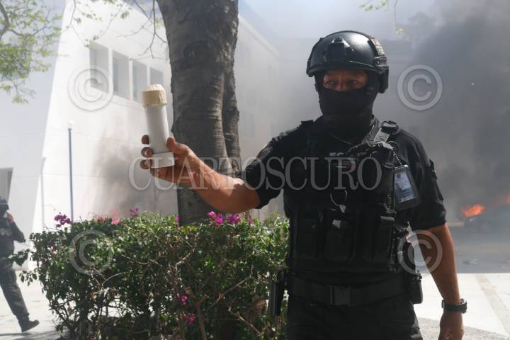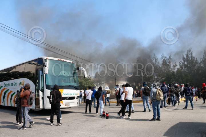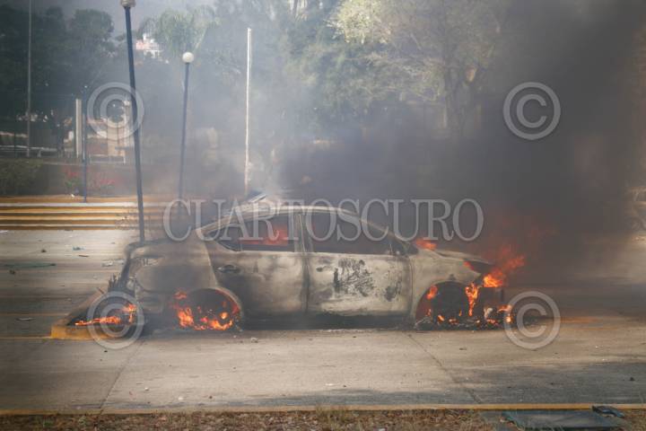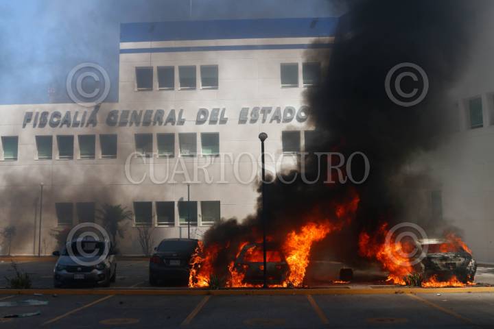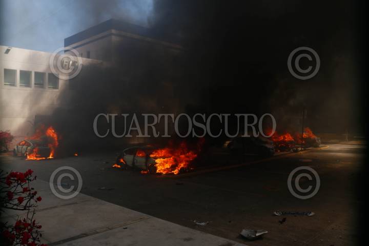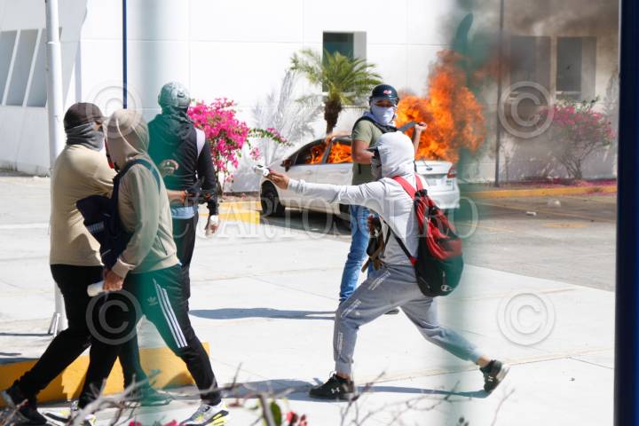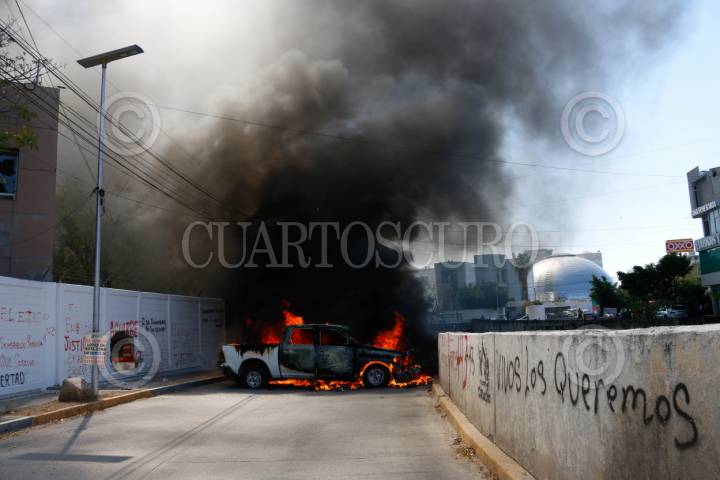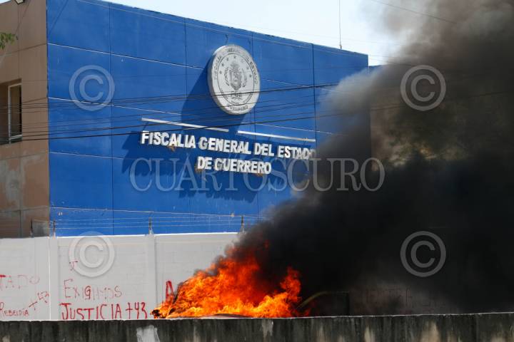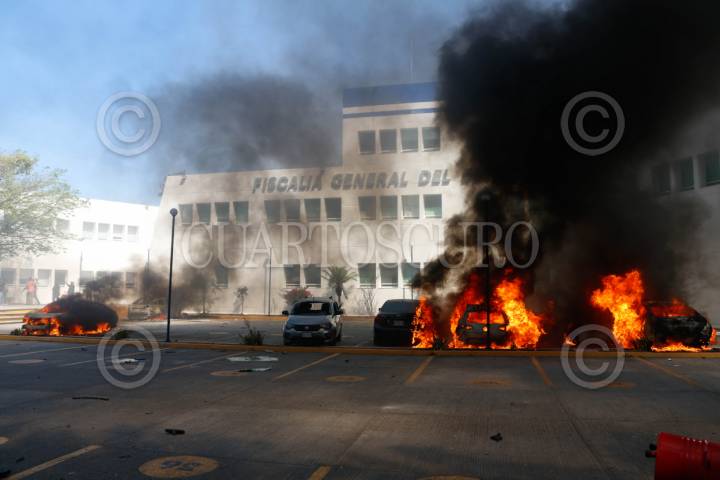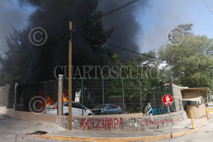 CHILPANCINGO, GUERRERO, 12MARZO2024.- Estudiantes de la Normal Rural de Ayotzinapa ingresaron a las instalaciones de la Fiscalía General del Estado (FGE) para lanzar petardos y bombas molotov, donde quemaron los vehículos que localizaron en el área del estacionamiento. Los normalistas rurales llegaron a la capital del estado a bordo de seis autobuses de pasajeros, ingresaron por la entrada norte de la capital del estado y se dirigieron al sector sur, para llegar hasta las instalaciones de la Fiscalía General del Estado (FGE). A pesar del resguardo que habían implementado en la zona elementos de la Policía del Estado y de la Guardia Nacional (GN) con equipo antimotin, no hicieron mucho por contener la irrupción de los estudiantes. La actividad se generó tras la revelación hecha por el presidente de la República, Andrés Manuel López Obrador, en el sentido de que el policía responsable del asesinato cometido en contra de su compañero, Yanqui Kothan Gómez Peralta se había fugado. FOTO: DASSAEV TÉLLEZ ADAME/CUARTOSCURO.COM