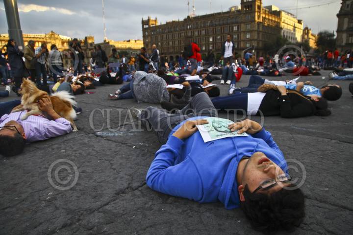 MÉXICO, D.F., 08NOVIEMBRE2014.- Decenas de personas se manifestaron en el zócalo de la ciudad, realizaron un flashmob donde simularon la muerte de los 43 normalistas como protesta por su desaparición en la ciudad Iguala. FOTO: RASHIDE FRIAS /CUARTOSCURO.COM
