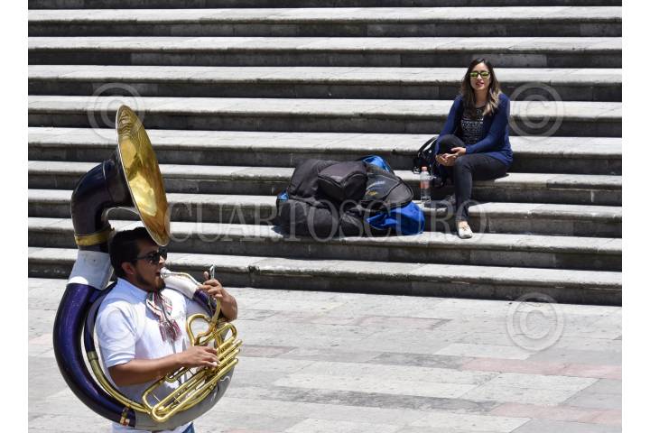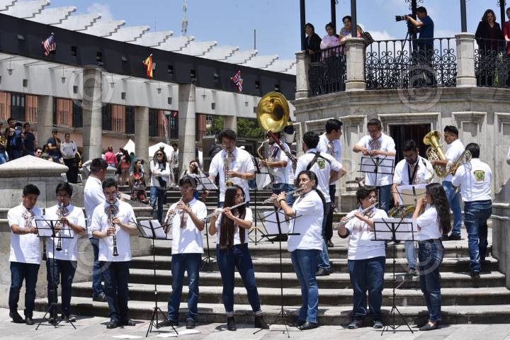 TOLUCA, ESTADO DE MÉXICO, 08SEPTIEMBRE2019.- Integrantes de la Banda Sinfónica Juvenil de la UAEM tocaron algunas piezas de música mexicana en la Plaza González Arratia, como parte de la grabación de un flashmob por las Fiestas Partrias. FOTO: CRISANTA ESPINOSA AGUILAR /CUARTOSCURO.COM