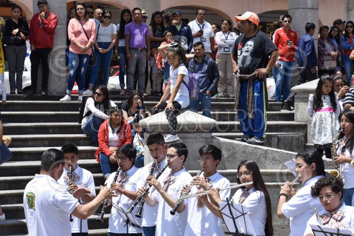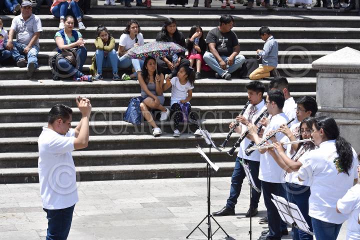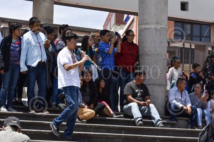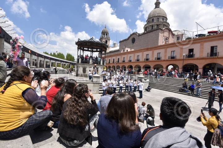TOLUCA, ESTADO DE MÉXICO, 08SEPTIEMBRE2019.- Integrantes de la Banda Sinfónica Juvenil de la UAEM tocaron algunas piezas de música mexicana en la Plaza González Arratia, como parte de la grabación de un flashmob por las Fiestas Patrias. FOTO: CRISANTA ESPINOSA AGUILAR /CUARTOSCURO.COM