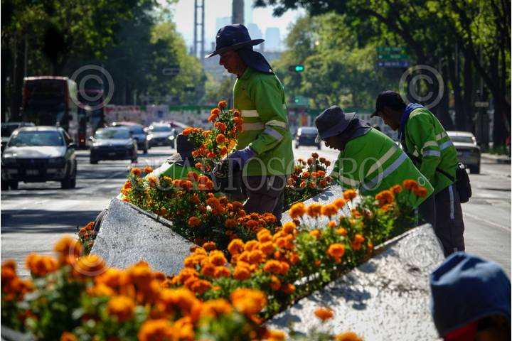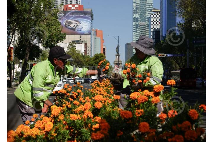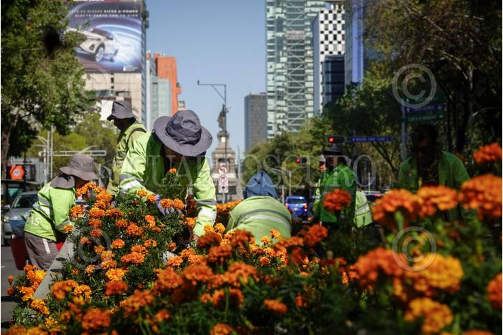 CIUDAD DE MÉXICO, 09NOVIEMBRE2024.- Como parte del Programa Sembrando Parques, trabajadores realizan labores de mantenimiento de las flores de cempasúchil plantadas en el camellón de Avenida Paseo de la Reforma. Sembrando Parques es una iniciativa del Gobierno capitalino que consiste en la creación y rehabilitación de la infraestructura ambiental para crear y regenerar espacios dignos y mejorar la imagen urbana. FOTO: MAGDALENA MONTIEL/CUARTOSCURO.COM