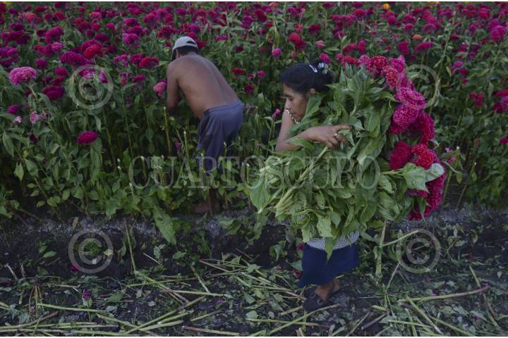 NEALTICAN, PUEBLA; 28OCTUBRE2017.- NEALTICAN, PUEBLA, 29OCTUBRE2015.- Cinco familias enteras, laboran en la corta de flor de cempasúchil en un campo ubicado a las faldas del volcán Popocatépetl; con jornadas de 12 y hasta 16 horas de trabajo ininterrumpidas logran la recolección de la tradicional flor para transportarla y comercializarla en la central de abastos y mercados locales. La flor de cempasúchil se utiliza principalmente como decoración y ofrenda ritual en el Día de Muertos. Es habitual utilizar los pétalos para marcar en el suelo el camino que deben seguir las almas de los difuntos hacia los altares domésticos levantados en su honor; puesto que según las creencia su particular olor es la guía a seguir. FOTO: HILDA RÍOS /CUARTOSCURO.COM