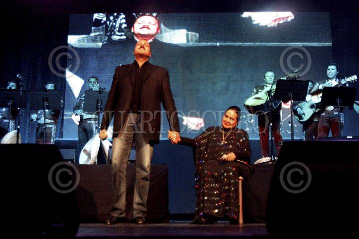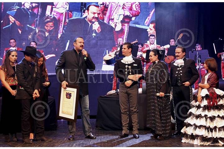 ZACATECAS, ZAC.,04NOVIEMBRE2012.- Pepe Aguilar y su madre Flore Silvestre, recibieron anoche, en el teatro Calderón un reconocimiento por su invaluable trayectoria artística y musical por parte del gobernador Miguel Alonso Reyes, en el marco del Congreso y Campeonato Nacional Charro. FOTO: ESPECIAL/CUARTOSCURO.COM