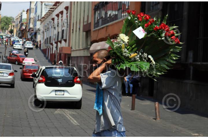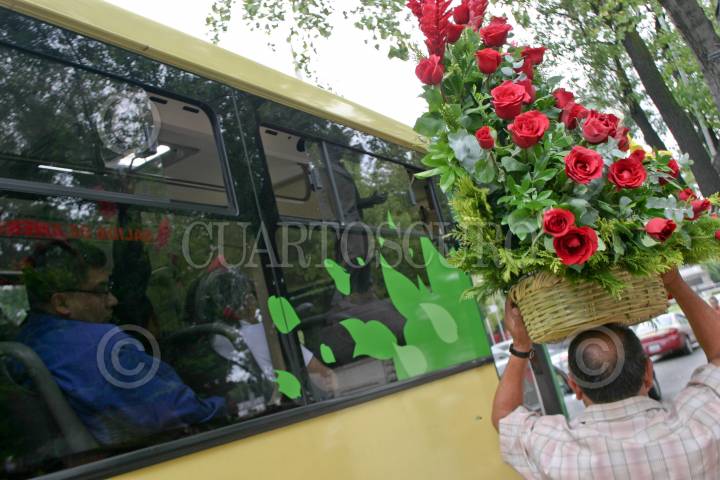 MÉXICO, D.F., 13AGOSTO2010.- Un hombre traslada un arreglo floral mientras un ocupante del transporte público lo observa. FOTO: MISAEL VALTIERRA/CUARTOSCURO.COM