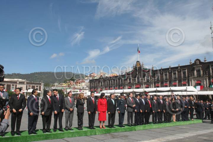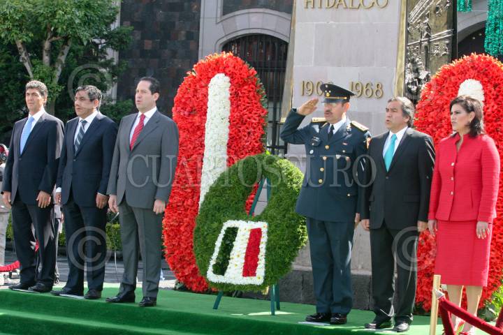 TOLUCA, ESTADO DE MÉXICO, 16SEPTIEMBRE2011.- Eruviel Ávila Villegas, gobernador del Estado de México junto con integrantes de su gabinete, montaron una guardia de honor y una ofrenda floral en el hemiciclo a Miguel Hidalgo en la plaza de los Mártires. FOTO: SAÚL LÓPEZ/CUARTOSCURO.COM