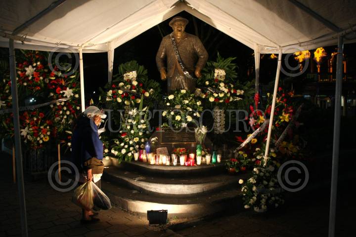 CHIGNAHUAPAN, PUEBLA, 04OCTUBRE2011.- A 4 días del fallecimiento de Gaspar Henaine "Capulina", habitantes del municipio de Chignahuapan acuden al monumento de la figura cómica que se encuentra ubicada en la plaza principal de la localidad, donde los chignahupenses colocan ofrendas florales y veladoras desde que se conoció la trágica noticia de su deceso, para conmemorar a su paisano. El monumento a Capulina, fue colocado el 6 de enero de 2008, y hasta la fecha es observada por todos los pobladores y visitantes quienes recuerdan con afecto al “rey del humorismo blanco”. FOTO: FRANCISCO GUASCO/CUARTOSCURO.COM