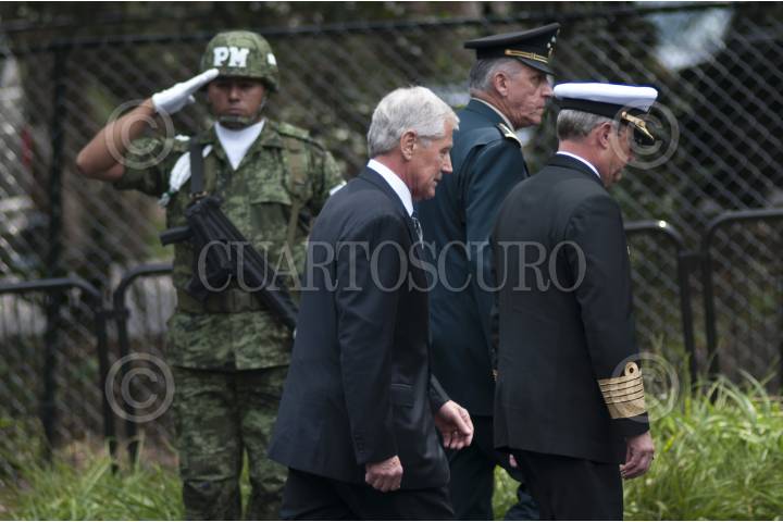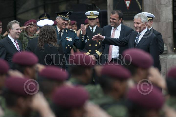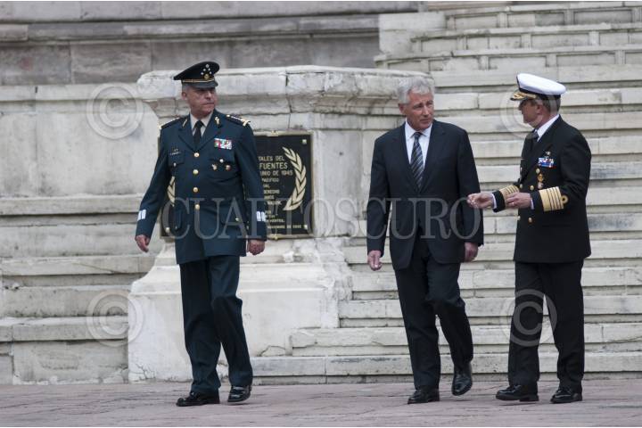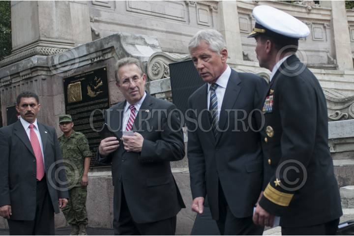 MÉXICO, D.F. 24ABRIL2014.- Timothy Charles Hagel, Secretario de Defensa de los Estados Unidos de América; Salvador Cienfuegos Cepeda, Secreatio de la Defensa Nacional; y Vidal Francisco Soberón Sanz, Secretario de Marina Armada de México; acudieron al Monumento a las Águilas Caídas donde el Secretario de Defensa de los Estados Unidos colocó una ofrenda floral en honor al escuadrón 201 que participó en la segunda guerra mundial. FOTO: IVÁN STEPHENS /CUARTOSCURO.COM