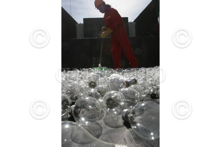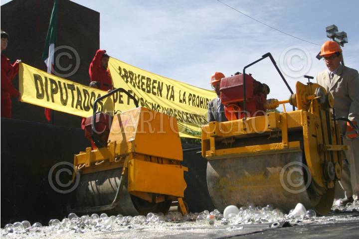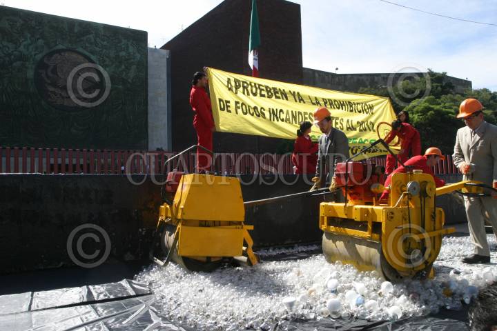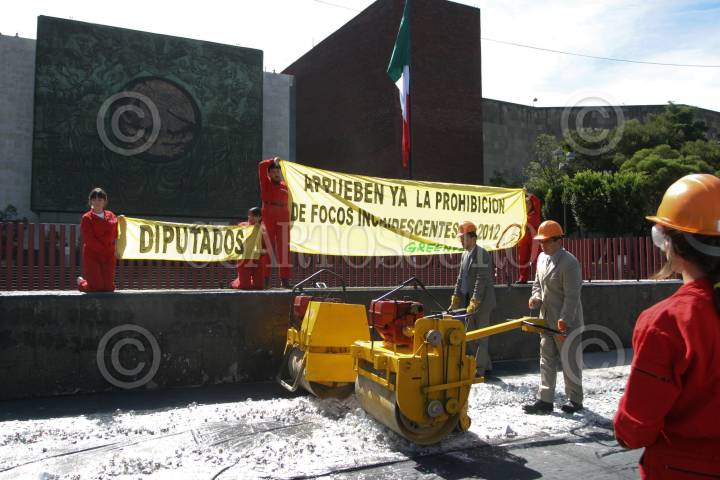 MÉXICO D.F., 27ABRIL2010.- Activistas integrantes de Green Peace, destruyeron con aplanadoras mas de 3 mil focos, frente a la Cámara de Diputados, esto para exigir a los legisladores aprobar la Ley de Aprovechamiento Sustentable de la Energía, antes del 29 de Abril fecha en la que se concluye el segundo periodo ordinario de sesiones de esta legislatura. FOTO: GUILLERMO PEREA/CUARTOSCURO.COM