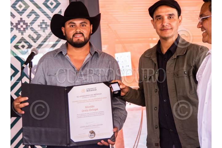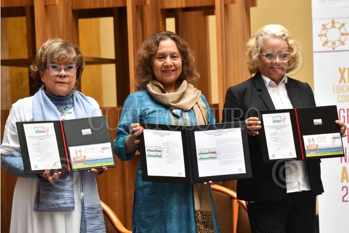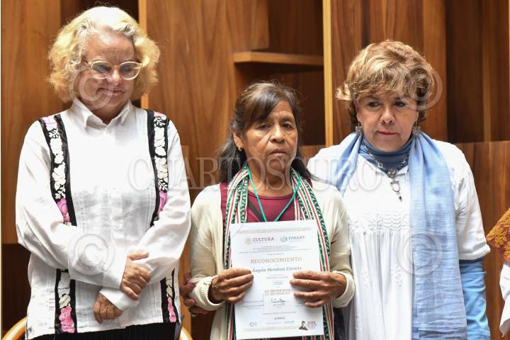 CIUDAD DE MÉXICO, 17JULIO2024.- Emma Yanes Rizo, directora de Fonar, y Rocío Bárcena, directora general de Palacio Postal, durante entregan a la ciudadana Ángela Mendoza Estrada su reconocimiento durante la premiación por la XLIX Edición del Concurso Gran Premio Nacional de Arte Popular 2024. FOTO: MARIO JASSO/CUARTOSCURO.COM
