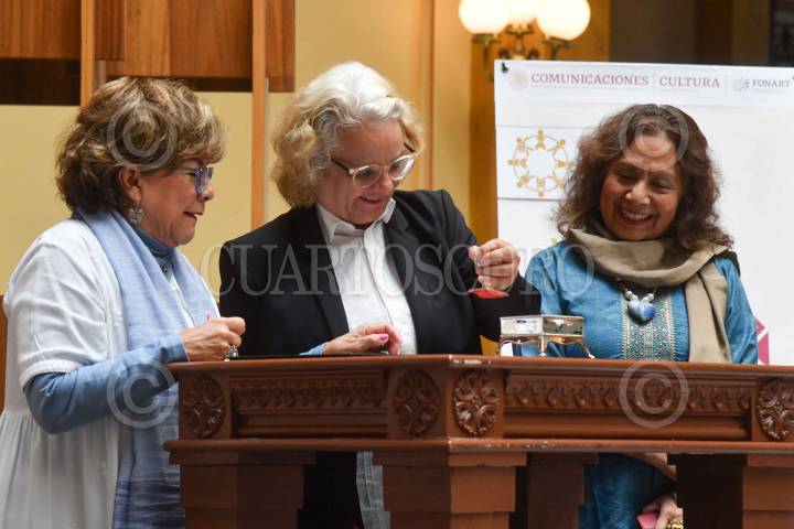 CIUDAD DE MÉXICO, 17JULIO2024.- Rocío Bárcena, directora general de Palacio Postal; Emma Yanes Rizo, Directora General de Fonart, y Lucina Jiménez, directora del INBAL, durante la Cancelación del sello postal conmemorativo del 50 aniversario del Fonart, y la ceremonia de premiación por la XLIX Edición del Concurso Gran Premio Nacional de Arte Popular 2024. FOTO: MARIO JASSO/CUARTOSCURO.COM