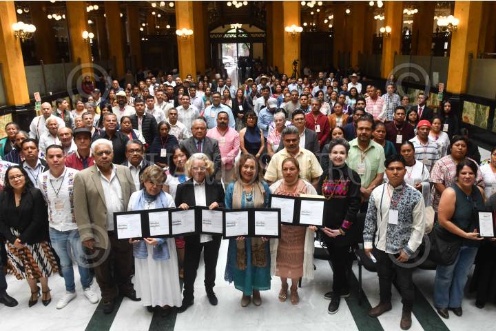 CIUDAD DE MÉXICO, 27JUNIO2024.- Marco Antonio Meza, director general de la Lotería Nacional; Marina Nuñez Bespalova, Subsecretaria de Desarrollo Cultural de la Secretaría de Cultura; el equipo del Fonart y artesanos de varios estados de la República posaron durante la inauguración de la feria artesanal y la presentación del billete de Lotería Nacional conmemorativo por el 50 aniversario del Fonart. FOTO: ALICE MORITZ/CUARTOSCURO.COM