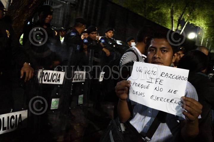 MÉXICO, D.F., 01JULIO2012.- Ciudadanos originarios de otros estados, así como natales de la Ciudad de México, los cuales no pudieron votar debido a la escazes de boletas electorales, protestan frente a las instalaciones del Instituto Federal Electoral. FOTO: PEDRO ANZA /CUARTOSCURO.COM