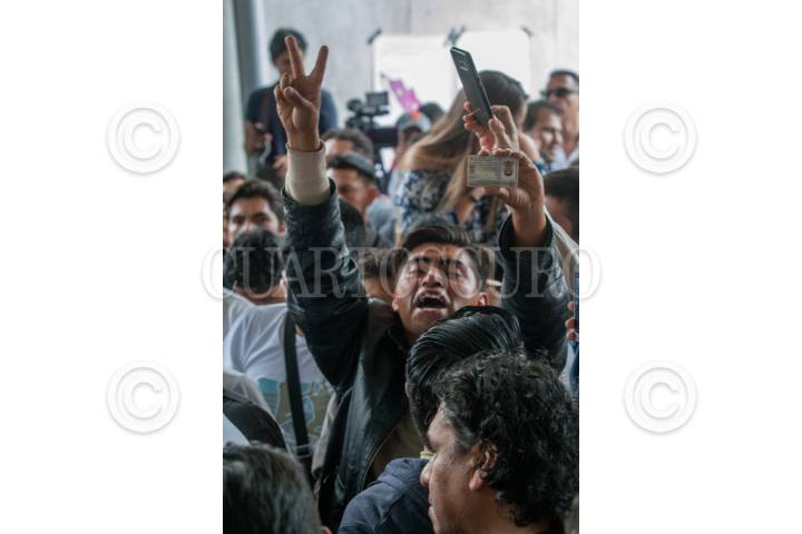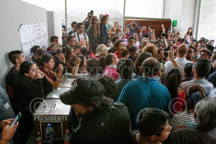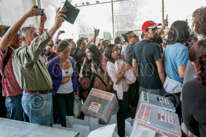 CIUDAD DE MÉXICO 01JULIO2018.- Personas provenientes de diversos Estados de la República acudieron desde temprano a formarse en las casillas especiales ubicadas en la Biblioteca José Vasconcelos. Sin embargo se agotaron las 1500 boletas de las dos casillas desde las 3 de la tarde, por lo que decidieron dar portazo y manifestar su descontento. FOTO: JUAN PABLO ZAMORA /CUARTOSCURO.COM