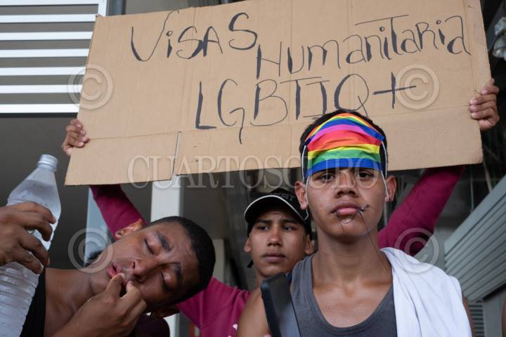 Integrantes de la comunidad LGBTTI se cocieron los labios en la Aduana Cerro Gordo del INM en donde denunciaron discriminación por parte de las autoridades, ellos buscan una visa humanitari que les permita avanzar por el país de forma segura.