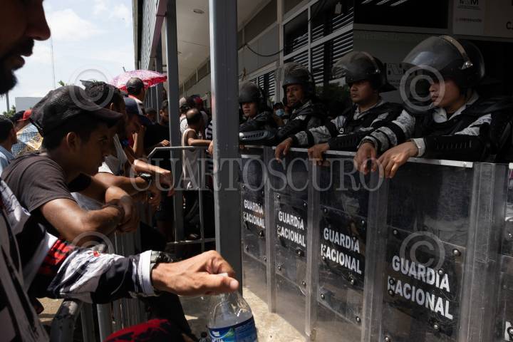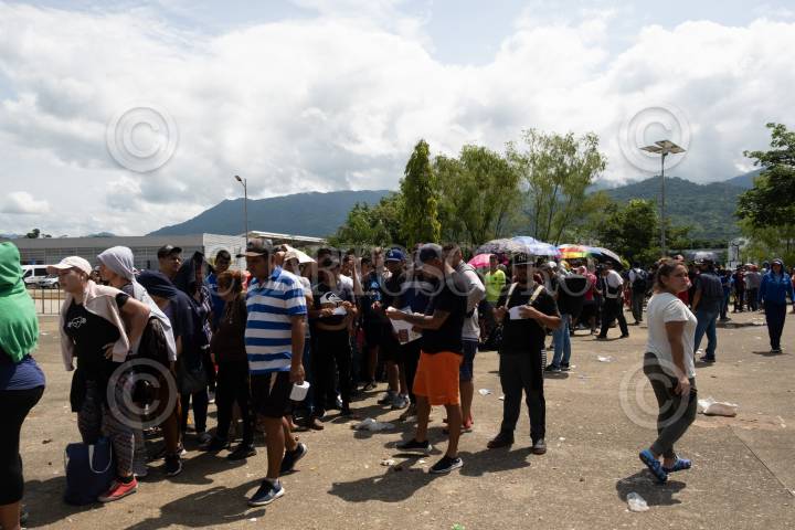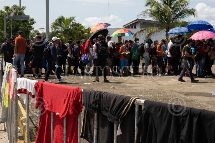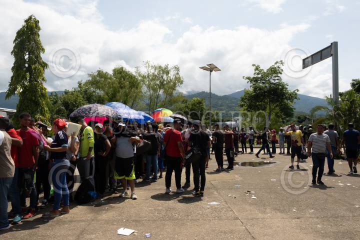 Integrantes de la Caravana migrante que partió el pasado seis de junio de Tapachula permanece en la Aduana de Cerro Gordo esperando ser atendidos para otorgarles el formato múltiple con vigencia 30 días para poder salir del país en cualquier a de sus fronteras.