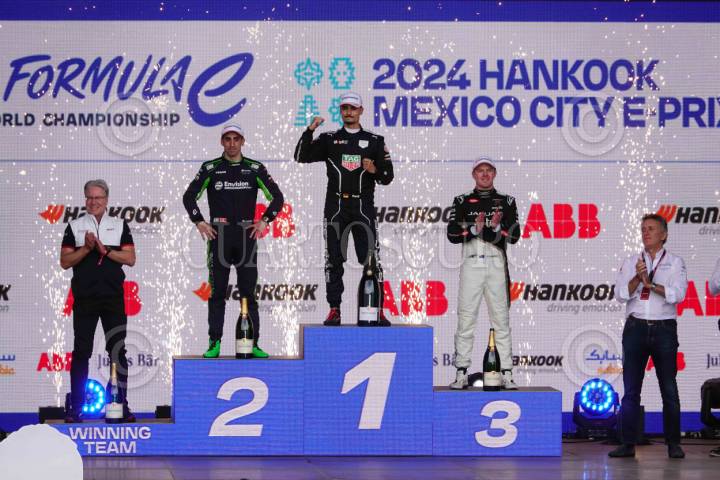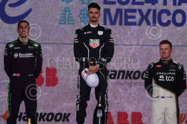 CIUDAD DE MÉXICO, 11ENERO2025.- El piloto británico Oliver Rowland (Nissa) se coronó campeón del 2025 Hankook Mexico City E-Prix de la Fórmula E en el Autódromo Hermanos Rodríguez. Seguido por Antonio Félix Da Costa y el actual campeón Pascal Wehrlein ambos de la escudería Porsche. FOTO: GALO CAÑAS/CUARTOSCURO.COM