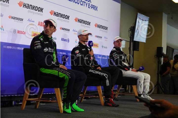CIUDAD DE MÉXICO, 13ENERO2024.- Los pilotos Pascal Wehrlein de la escudería TAG Hever Porche, Nick Cassidi de Jaguar TCS Racing y Sēbastien Buemi de Envision, ganadores de la E-Prix de México 2024 de la Fórmula E, durante la conferencia a medios después de la carrera en el Autódromo Hermánanos Rodríguez. FOTOS: ROGELIO MORALES /CUARTOSCURO.COM