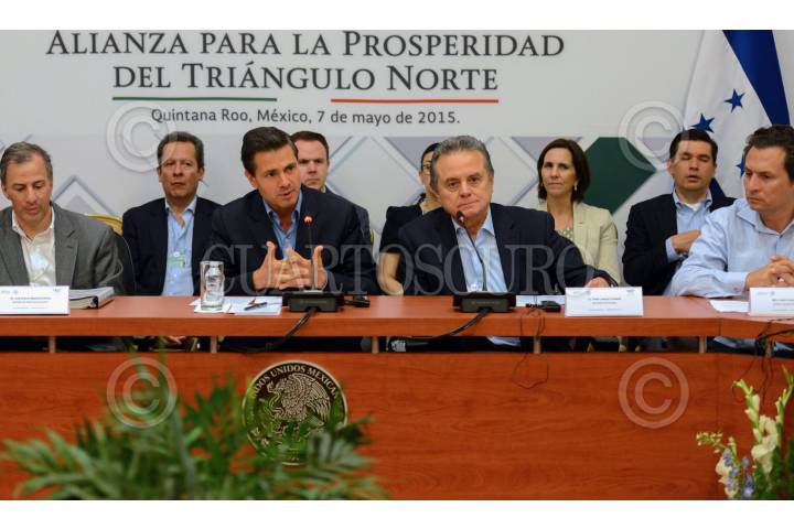 SOLIDARIDAD, QUINTANA ROO, 07MAYO2015.-. El Presidente Enrique Peña Nieto encabezó una reunión de la Alianza para la Prosperidad del Triángulo del Norte en el marco de sus actividades en el Foro Económico Mundial sobre América Latina 2015. En el encuentro participaron los ministros de Relaciones Exteriores de Guatemala, Carlos Raúl Morales Moscoso; de El Salvador, Hugo Martínez Bonilla, y de Colombia, María Ángela Holguín; el embajador de Honduras en México, Mariano Castillo; el consejero del Departamento de Estado de los Estados Unidos de América, Thomas Shannon, y el presidente del Banco Interamericano de Desarrollo (BID), Luis Alberto Moreno. Al frente, de izquierda a derecha el canciller José Antonio Meade, el presidente Enrique Peña Nieto, Pedro Joaquín Coldwell, secretario de energía, y Emilio Lozoya, director de Petróleos Mexicanos. FOTO: PRESIDENCIA /CUARTOSCURO.COM