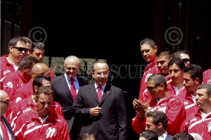 MÉXICO, D.F., 24MARZO2009.- Felipe Calderon Hinojosa Presidente de México recibio esta mañana en las escalinatas de la residencia oficial de los Pinos al equipo de béisbol Diablos Rojos de México FORO: SÁSHENKA GUTIERREZ/CUARTOSCURO.COM