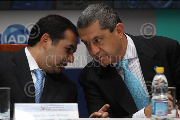MÉXICO, D.F., 27SEPTIEMBRE2010.- Carlos Aceves del Olmo, Presidente de la Comisión del Trabajo y Previsión Social junto a Javier Lozano, Secretario del Trabajo, durante la inauguracion del foro: "Por un mercado laboral mas eficiente" por lo que fue sacado por elementos de seguridad del lugar. FOTO: ENRIQUE ORDÓÑEZ/CUARTOSCURO.COM