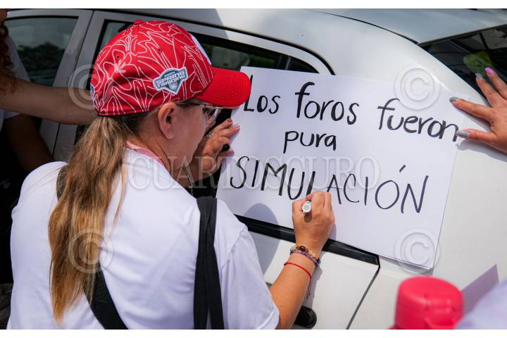 CIUDAD DE MÉXICO, 19AGOSTO2024.- Una mujer escribió un cartel que dice “Los foros fueron pura simulación” frente a la sede Prisma del Poder Judicial durante el paro de labores de los Trabajadores del Poder Judicial de la Federación (PJF), en protesta contra la reforma propuesta por el Ejecutivo Federal, que según ellos, amenaza la independencia judicial y los derechos laborales. Diversos colectivos han convocado a la sociedad a unirse en defensa del país. FOTO: ALICE MORITZ/CUARTOSCURO.CO