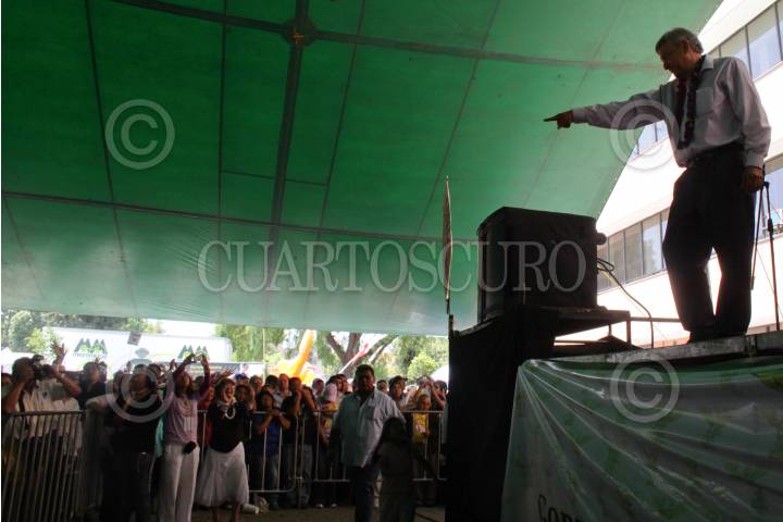 MÉXICO, D.F., 04ABRIL2009.- El ex candidato presidencial Ándres Manuel López Obrador durante el mitín que encabezo en la explanada de la delegación Azcapotzalco, el ex candidato visitara las 16 entidades federativas todo esto para fortalecer el Movimiento en Defensa de la Economía Popular FOTO: SÁSHENKA GUTIÉRREZ/CUARTOSCURO.COM