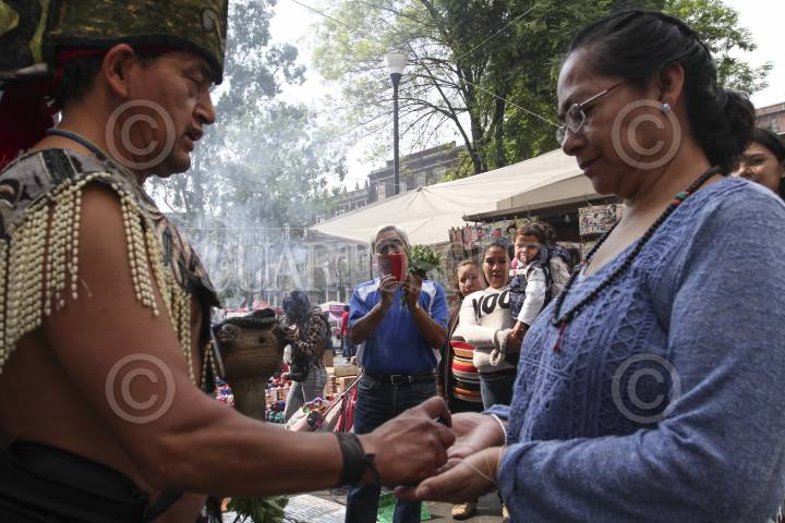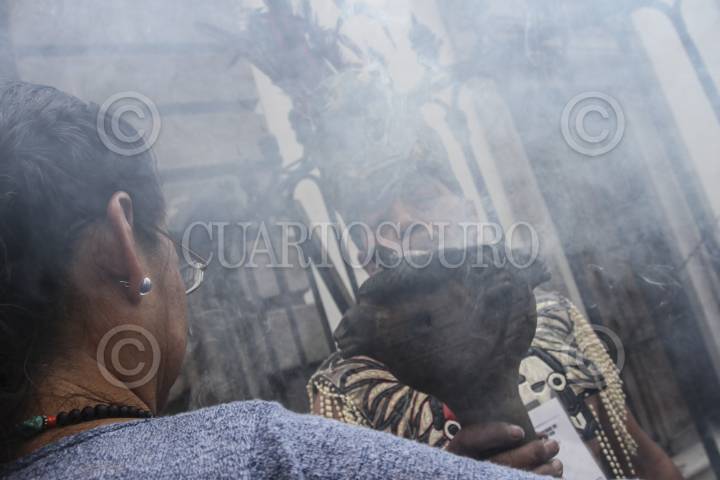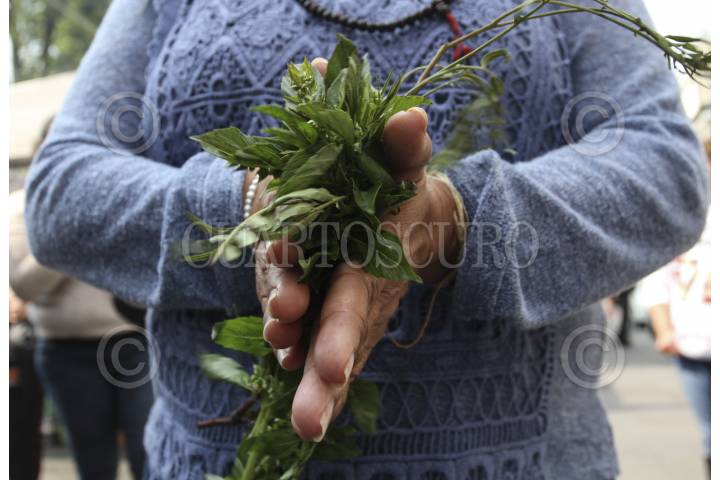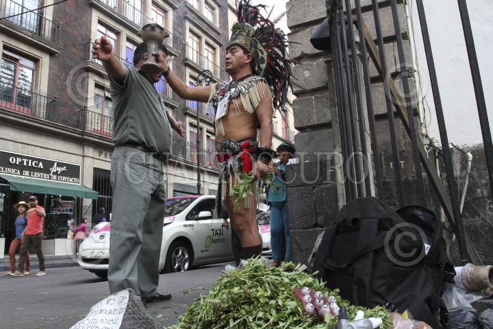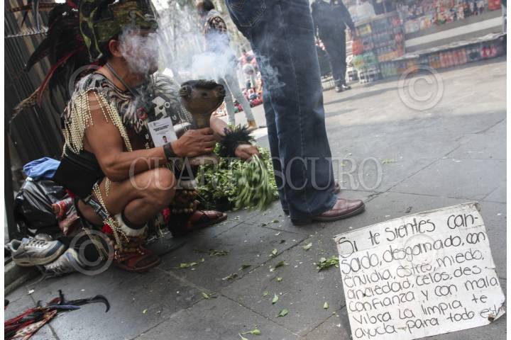MÉXICO, D.F., 03ENERO2016.- Gustavo Leyva Reyes, quien posee el título de antropólogo, realiza "limpias" o sanaciones espirituales contra el miedo, la ansiedad y el mal de ojo, desde hace más de 15 años a un costado de la Catedral Metropolitana. Con un ramo de albaca y un humeador con copal limpia el espíritu de aquellos que acuden a él para encontrar fortuna y tranquilidad en este nuevo año. Al momento de atender a sus clientes les solicita que froten entre sus manos un ramo de albaca 600 veces, pues esto está ligado a una antigua tradición náhuatl. Gustavo se queja principalmente de las autoridades policiacas que no le permiten laborar tranquilamente. FOTO: MARÍA JOSÉ MARTÍNEZ /CUARTOSCURO.COM