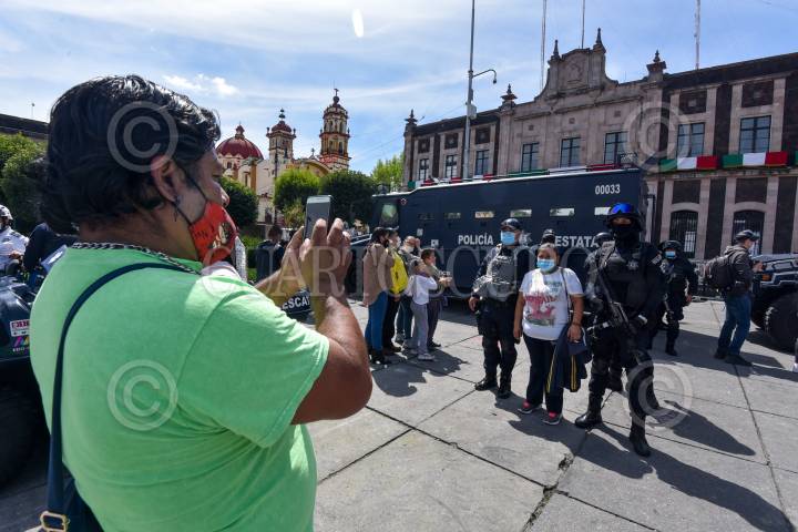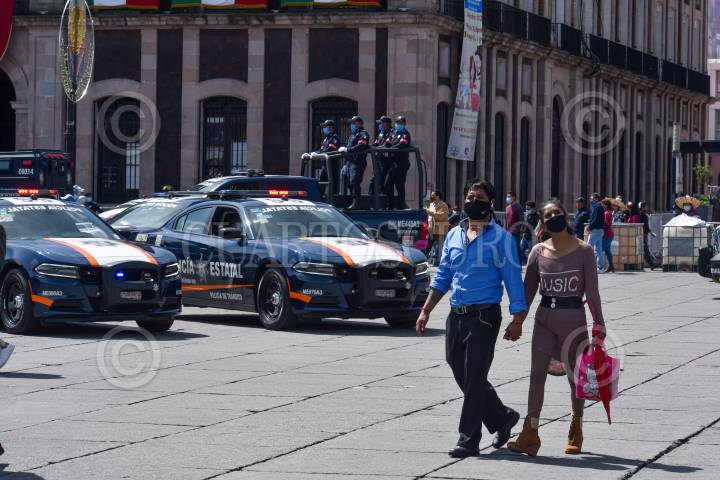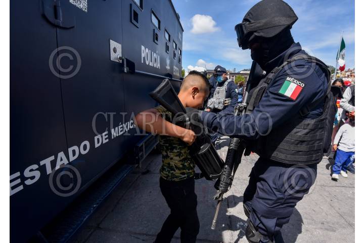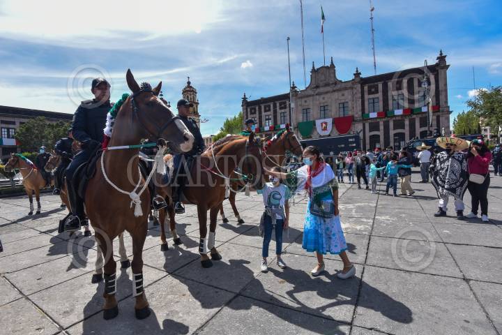 Familias mexiquenses esperaron el término del breve desfile por el 211 Aniversario del Inicio de la Independencia y se tomaron la fotografía del recuerdo con elementos de la Secretaría de Seguridad Estatal.