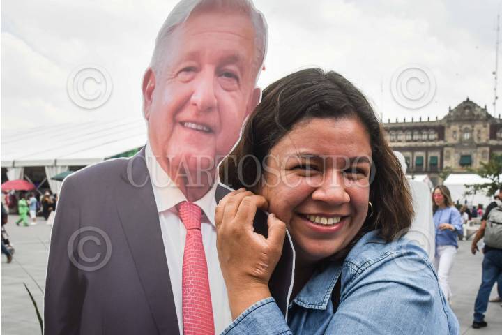 CIUDAD DE MÉXICO, 13AGOSTO2024.- Simpatizantes de Andrés Manuel López Obrador, presidente de México, se toman fotografías con réplicas de cartón del mandatario colocadas en la explanada del zócalo capitalino por la organización civil "Hasta siempre presidente". Se contempla que el presidente asista a la presentación del libro de su esposa Beatriz Gutiérrez Müller titulado "Feminismo Silencioso". FOTO: MARIO JASSO/CUARTOSCURO.COM