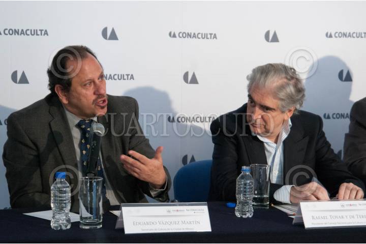 MÉXICO, D.F., 13OCTUBRE2015.- Rafael Tovar y de Teresa, titular de CONACULTA y Eduardo Vázquez Martín, secretario de Cultura local, participaron en la conferencia de prensa para presentar el Primer Festival Internacional Foto México, el cual será inaugurado con el próximo 27 de octubre en el Centro de la Imagen, y tendrá 130 exposiciones en más de 120 sedes por toda la República Mexicana. FOTO: DIEGO SIMÓN SÁNCHEZ /CUARTOSCURO.COM