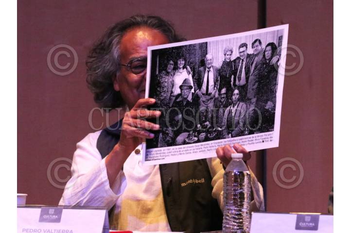 CUERNAVACA, MORELOS, 29AGOSTO2025.- El fotoperiodista Pedro Valtierra Ruvalcaba durante la presentación de su libro Sin miedo a la luz en la sala Manuel M Ponce del Jardín Borda. En la imagen, Pedro Valtierra sostiene una foto donde aparece entre fotógrafos como Héctor García, Walter Reuter, Oscar Menéndez y Paulina Lavista, tomada hace 41 años. FOTO: MARGARITO PERÉZ RETANA/CUARTOSCURO.COM