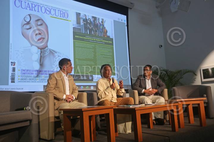 Mario Rosales Ortega (Izq), Coordinador de la Licenciatura en Arte y Creación del ITESO, Pedro Valtierra (Centro), Director de la Agencia Cuartoscuro y Ricardo Valencia García (Der), Mercadotecnia y Ventas de Sony, durante la presentación de la edición 173 de la Revista Cuartoscuro.