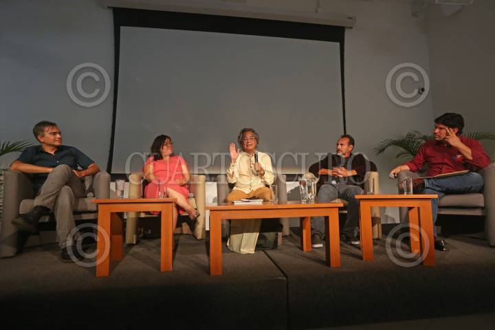 De Izquierda a Derecha, Rafael del Rio Fotoperiodista, Alejandra Leyva Fotoperiodista, Pedro Valtierra Director de la Agencia Cuartoscuro, Humberto Muñiz Fotoperiodista e mismo Iván González Vega Coordinador de la Licenciatura en Periodismo y Comunicación Publica, durante el conversatorio sobre fotoperiodismo que se llevo a cabo en las instalaciones de la Universidad Iteso.
