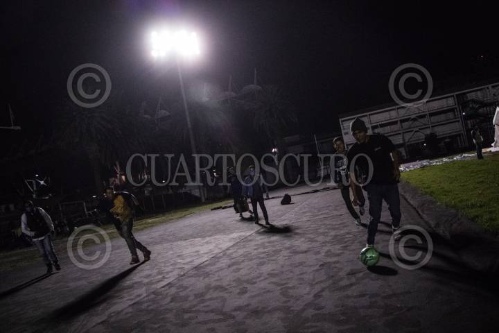 CIUDAD DE MÉXICO, 04NOVIEMBRE2018.- El fútbol es una de las formas de entretenimiento que los migrantes hondureños realizan para hacer menos agobiante su estancia en el albergue instalado en la Ciudad Deportiva. El primer contingente de migrantes en su mayoría provenientes de Honduras, arribaron a la capital del páis paso obligado en su ruta a la frontera norte con EE.UU. En su escala en la ciudad, son atendidos por la Comisión Nacional de Derechos Humanos, Cruz Roja y autoridades gubernamentales que les proveen alimentos durante su estancia. FOTOREPORTAJE: MISAEL VALTIERRA / CUARTOSCURO.COM