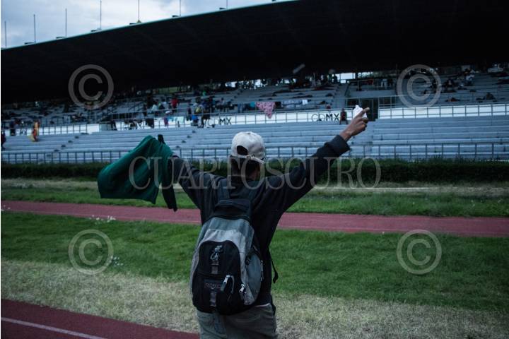 CIUDAD DE MÉXICO, 04NOVIEMBRE2018.- Alzando las manos con júbilo un migrante arriba a las instalaciones de Ciudad Deportiva donde fue instalado un albergue por autoridades de la Ciudad de México. El primer contingente de migrantes en su mayoría provenientes de Honduras, arribaron a la capital del páis paso obligado en su ruta a la frontera norte con EE.UU. En su escala en la ciudad, son atendidos por la Comisión Nacional de Derechos Humanos, Cruz Roja y autoridades gubernamentales que les proveen alimentos durante su estancia. FOTOREPORTAJE: MISAEL VALTIERRA / CUARTOSCURO.COM