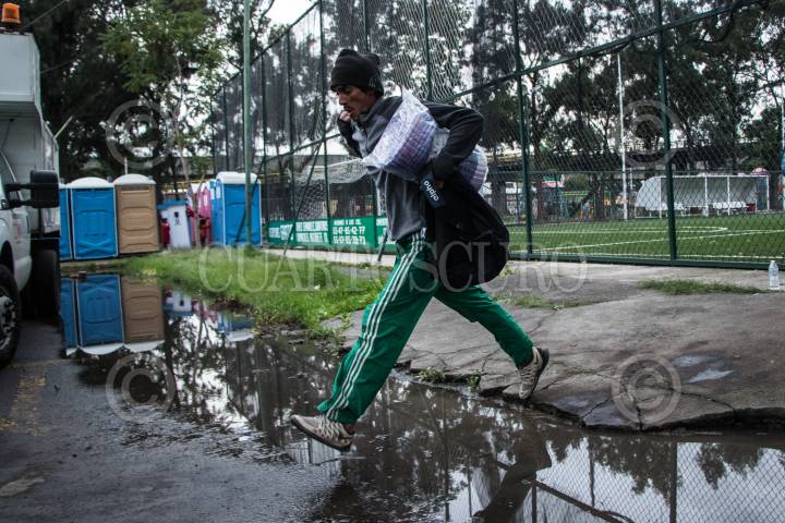 CIUDAD DE MÉXICO, 04NOVIEMBRE2018.- Un migrante cruza un charco de agua provocado por las lluvias registradas en las últimas horas en el albergue de Ciudad Deportiva. El primer contingente de migrantes en su mayoría provenientes de Honduras, arribaron a la capital del páis paso obligado en su ruta a la frontera norte con EE.UU. En su escala en la ciudad, son atendidos por la Comisión Nacional de Derechos Humanos, Cruz Roja y autoridades gubernamentales que les proveen alimentos durante su estancia. FOTOREPORTAJE: MISAEL VALTIERRA / CUARTOSCURO.COM