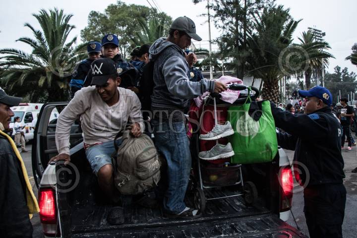 CIUDAD DE MÉXICO, 04NOVIEMBRE2018.- Auxiliados por policías de la Secretaría de Seguridad Pública de la Ciudad de México, Migrantes descienden de un vehículo a su llegada al albergue ubicado en Ciudad Deportiva. El primer contingente de migrantes en su mayoría provenientes de Honduras, arribaron a la capital del páis paso obligado en su ruta a la frontera norte con EE.UU. En su escala en la ciudad, son atendidos por la Comisión Nacional de Derechos Humanos, Cruz Roja y autoridades gubernamentales que les proveen alimentos durante su estancia. FOTOREPORTAJE: MISAEL VALTIERRA / CUARTOSCURO.COM