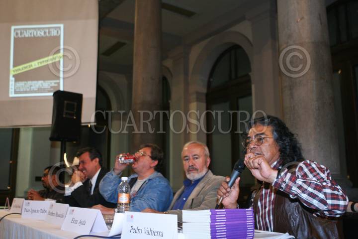 MÉXICO, D.F., 04MARZO2011.- Los periodistas Paco Ignacio Taibo II, Humberto Mussachio, Elena Ayala y Pedro Valtierra, durante la presentación del número 106 de la revista Cuartoscuro, dedicado en esta ocasión a la violencia, en el Club de Periodistas. FOTO: ISAAC ESQUIVEL/CUARTOSCURO.COM