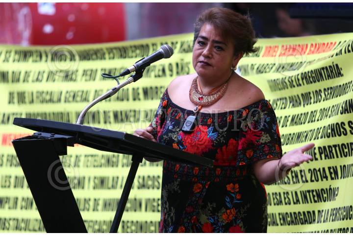 Amalia Hernández, activista social, durante su participación en el Dia Estatal de la Victima, donde se remodelo la ofrenda instalada en el portal del Palacio de Gobierno.
