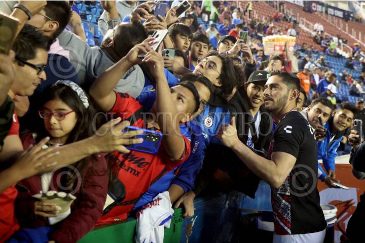 CIUDAD DE MÉXICO, 30ENERO2024. El jugador de Xolos y ex portero de Cruz Azul, Jesús Corona se toma fotografías con aficionados que coreaban su nombre previo al partido de fútbol Cruz Azul vs Tijuana correspondiente a la jornada 4 del Torneo Clausura 2024 de Liga BBVA MX, en el Estadio Ciudad de los Deportes. FOTO: EDGAR NEGRETE LIRA/CUARTOSCURO.COM