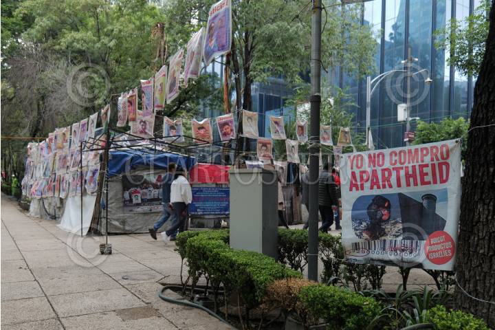 CIUDAD DE MÉXICO, 01JULIO2024.- Un cartel "Yo no compro Apartheid" en favor del boicot a los productos y empresas israelís que apoyan a la guerra contra Palestina. Esta colgado al lado del campamento en apoyo a los 43 estudiantes desaparecidos de Ayotzinapa en Paseo de la Reforma. FOTO: ALICE MORITZ/CUARTOSCURO.COM