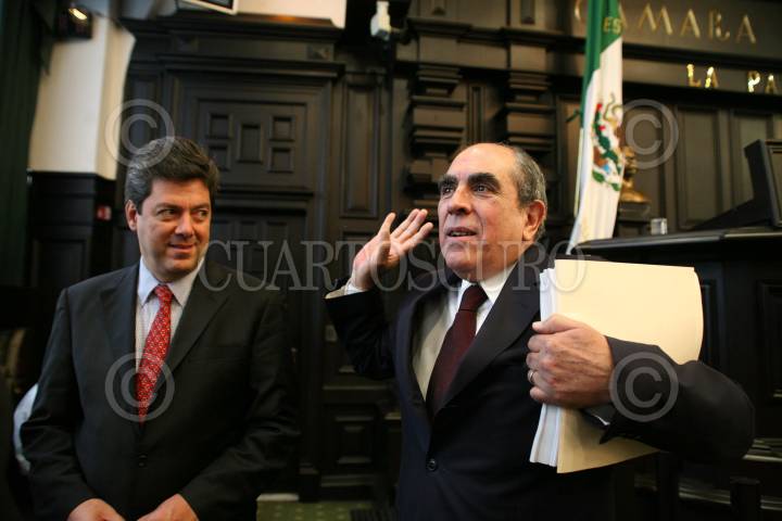 MÉXICO, D.F., 13OCTUBRE2009.- Tomás Torres Mercado junto a Pablo Gomez, ambos senadores del PRD durante la sesión donde se presentó el proyecto de decreto por el que se deroga la fracción XXVI del artículo 109, se añaden las fracciones XIX, XX y XXI al artículo 167 y se modifica el artículo 190 en sus párrafos décimo a treceavo, de la Ley del Impuesto sobre la Renta. FOTO: CUARTOSCURO.COM