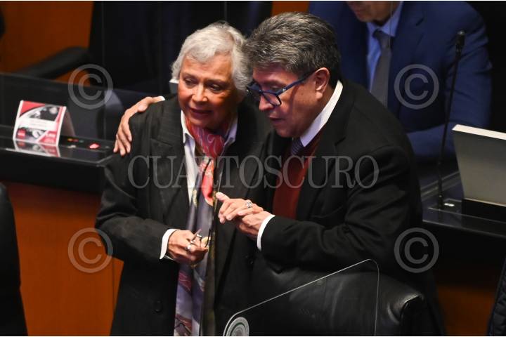 Olga Sánchez Cordero, presidenta de la Mesa Directiva del Senado y Ricardo Monreal, coordinador de la bancada de Morena en el Senado, dialogan durante la sesión de este jueves.