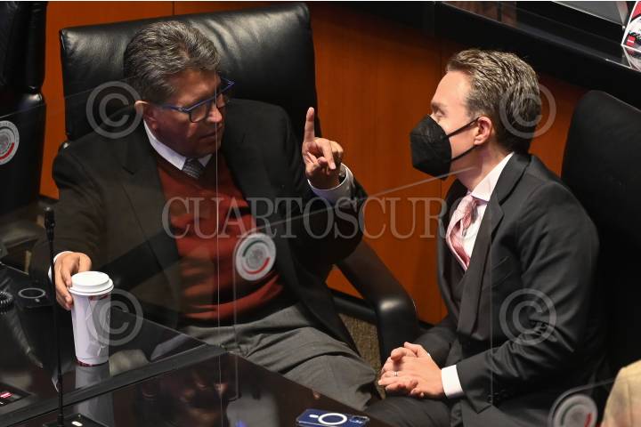 Ricardo Monreal, senador de Morena y Manuel Velazco, senador del PVEM, dialogan durante la sesión ordinaria del Senado.