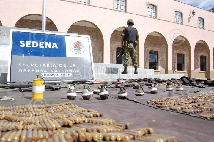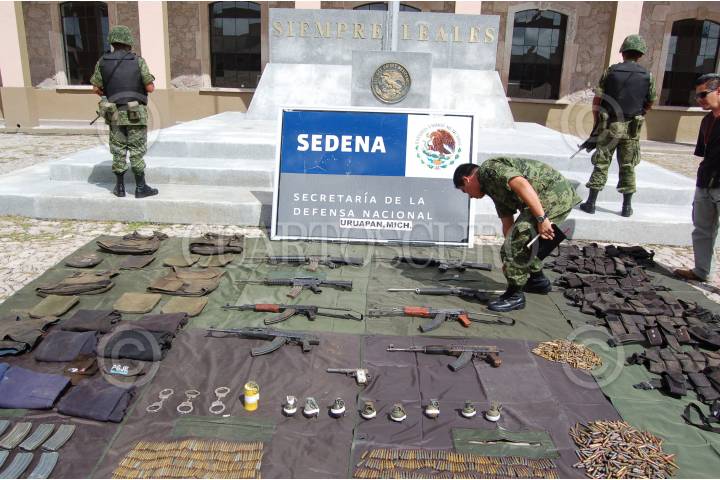 MORELIA, MICHOACAN, 25OCTUBRE2009.- Elementos del Ejército Mexicano decomisaron armas de grueso calibre, indumentaria policial y ocho granadas de fragmentación en la calle de Clavel de la colonia Ampliación Zapatistas del municipio de Uruapan. FOTO: LEOVIGILDO GONZÁLEZ/CUARTOSCURO.COM