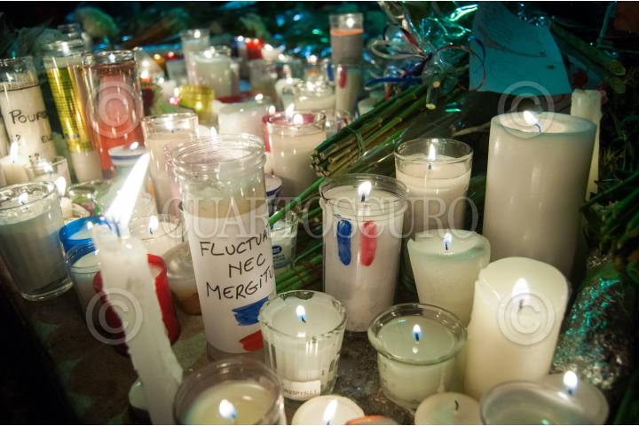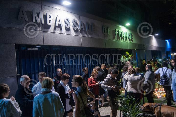 MÉXICO, D.F., 16NOVIEMBRE2015.- Decenas de franceses que radican en la ciudad, colocaron una ofrenda floral y veladoras afuera de la embajada de Francia en México como una muestra de solidaridad y protesta por los atentados que realizó el Estado Islámico en Paris el pasado viernes 13 donde murieron más de 120 personas. FOTO: DIEGO SIMÓN SÁNCHEZ /CUARTOSCURO.COM