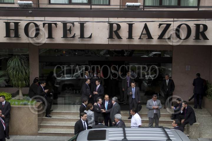 MÉXICO D.F., 21AGOSTO2013.- Francisco Arroyo, Presidente de la Mesa Directiva, de la Cámara de Diputados, acompañado de otros diputados federales esperan en las instalaciones de un hotel donde se concentraron para definir la situación del periodo extraordinario ya que el Palacio Legislativo permanece cercado por maestros de la CNTE, quienes no dejan pasar a los legisladores. FOTO: GUILLERMO PEREA /CUARTOSCURO.COM