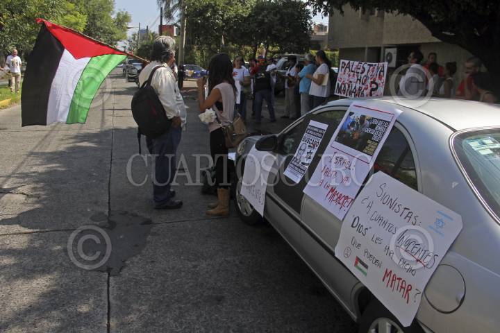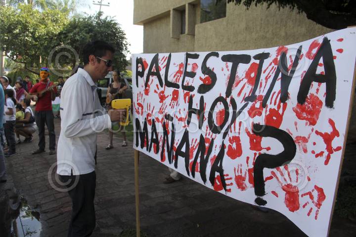 GUADALAJARA, JALISCO, 02AGOSTO2014.- Esta mañana integrantes del Colectivo Ecovida Pro Palestina se manifestaron a las afueras de la que reconocieron como embajada de Israel en Jalisco, esto en repudio a los ataques y ofensiva militar contra del pueblo Palestino en la Franja de Gaza que ha dejado cientos de muertos en su mayoría personas inocentes, señalaron. FOTO: FERNANDO CARRANZA GARCIA /CUARTOSCURO.COM