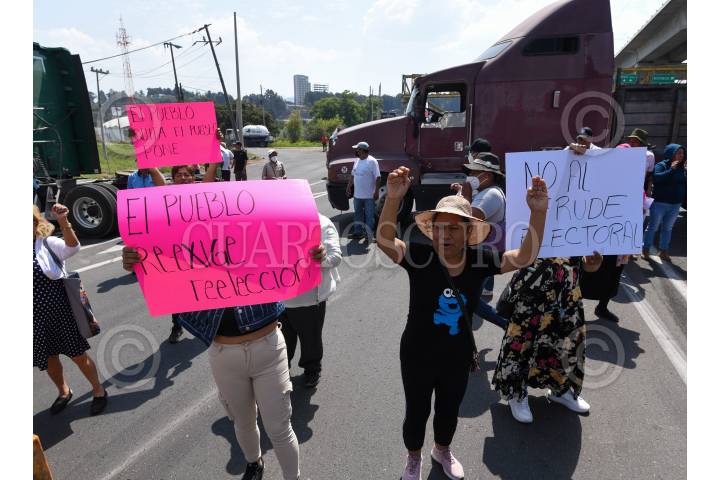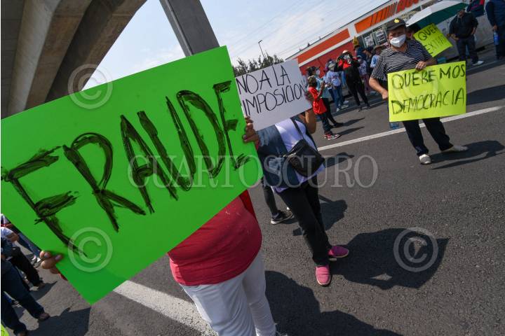 OCOYOACAC, ESTADO DE MÉXICO, 04JUNIO2024.- Vecinos de Ocoyoacac bloquearon la carretera Toluca-México en la entrada de este municipio exigiendo la reposición de la elección y mostraron su descontento por la victoria de Nancy Valdez Ruiz, candidata del PVEM, MORENA y PT, hermana del actual alcalde, denuncian fraude y robo de boletas, entre otras irregularidades que se dieren durante la elección. FOTO: CRISANTA ESPINOSA AGUILAR /CUARTOSCURO.COM